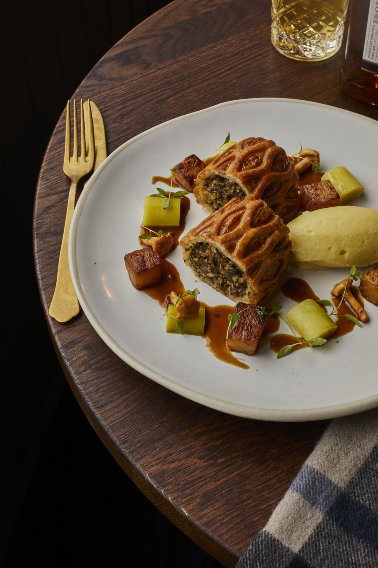 - Haggis Wellington: truffle mousseline, roasted swede, braised leeks & pickled girolles, lamb jus
